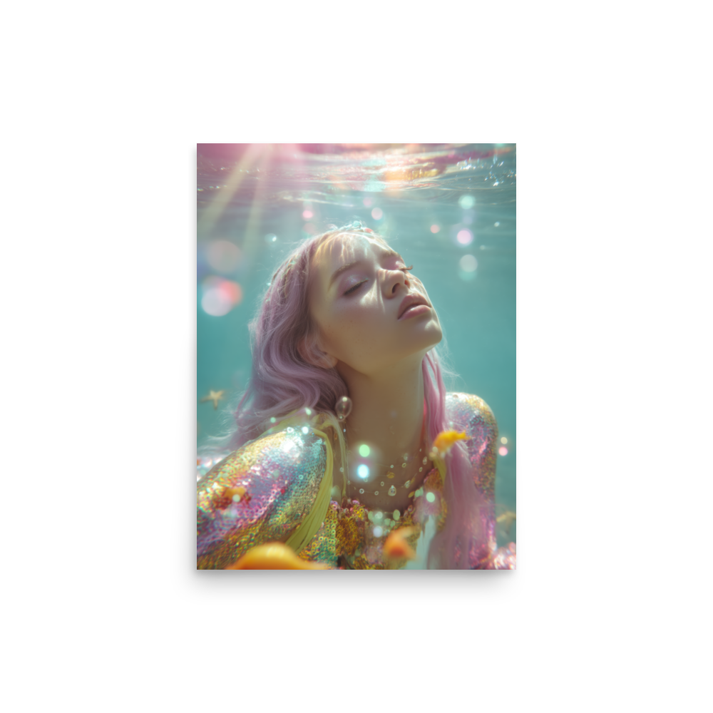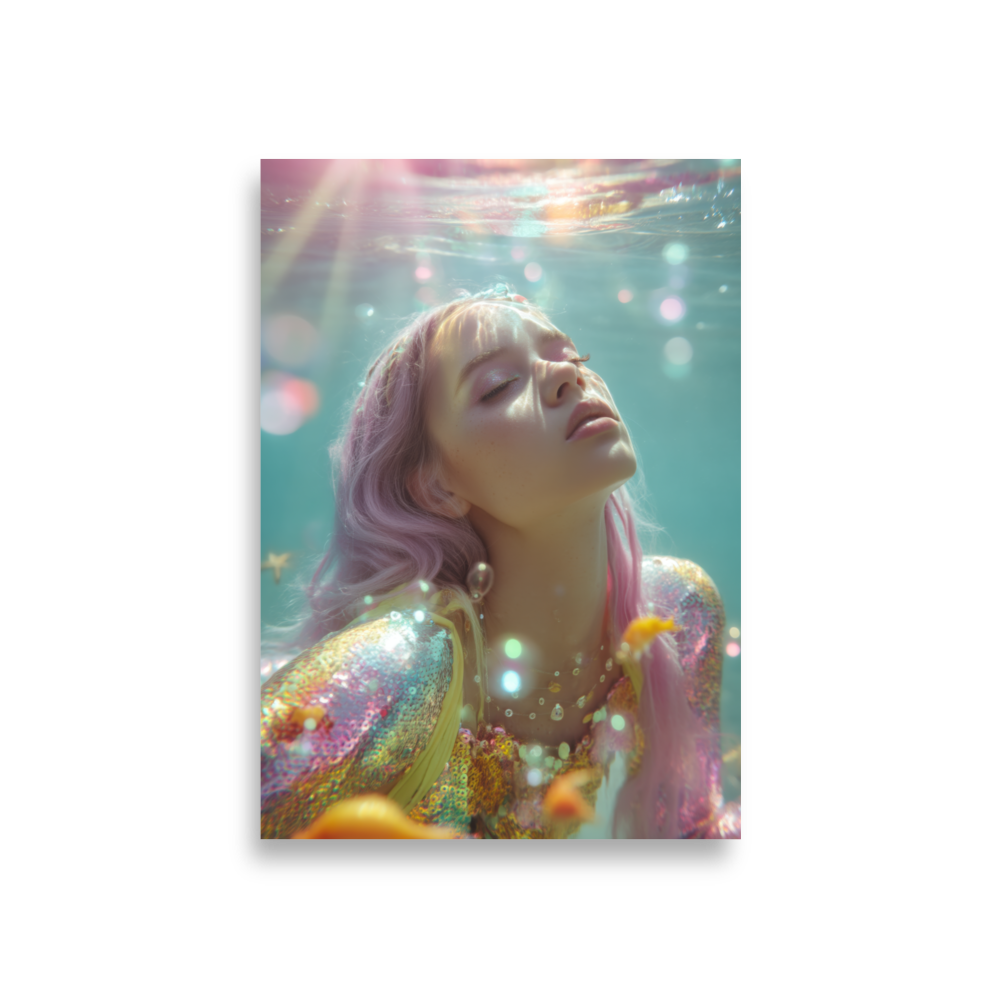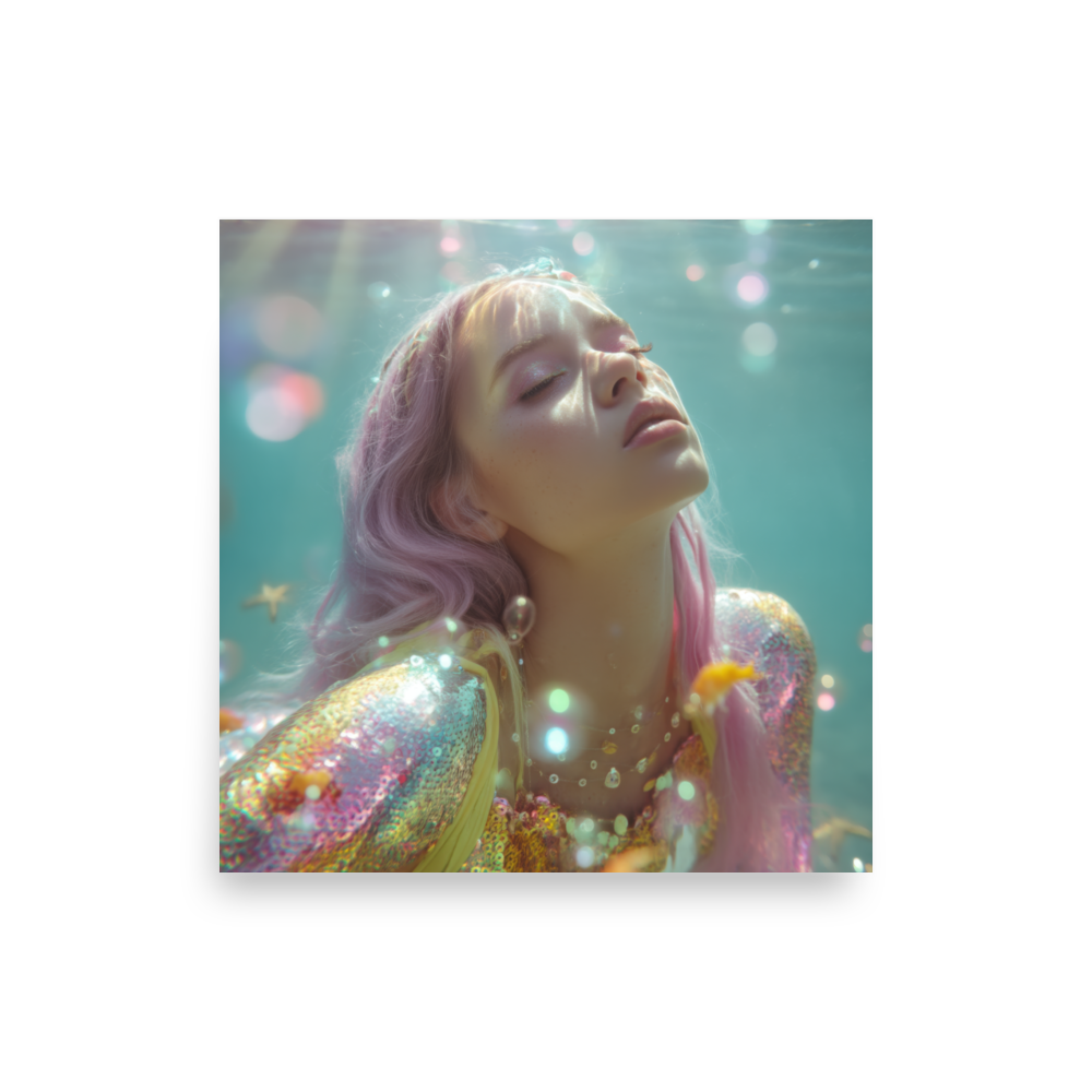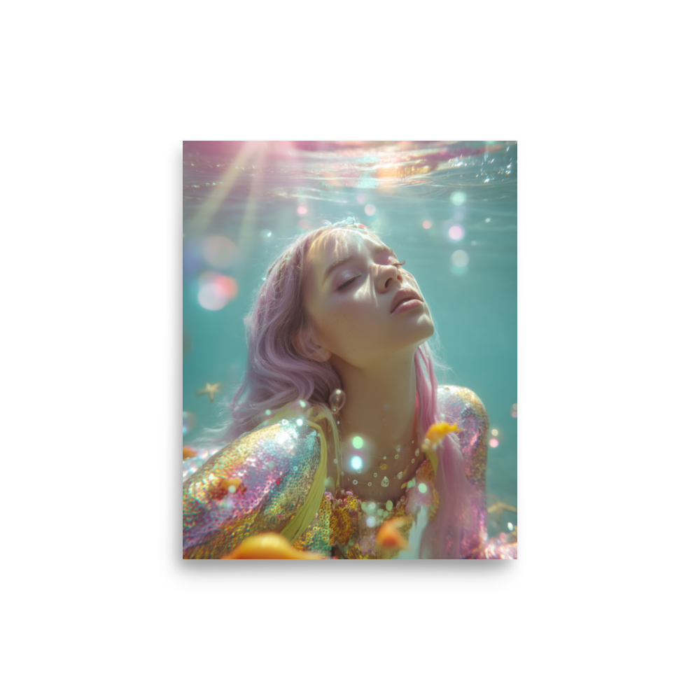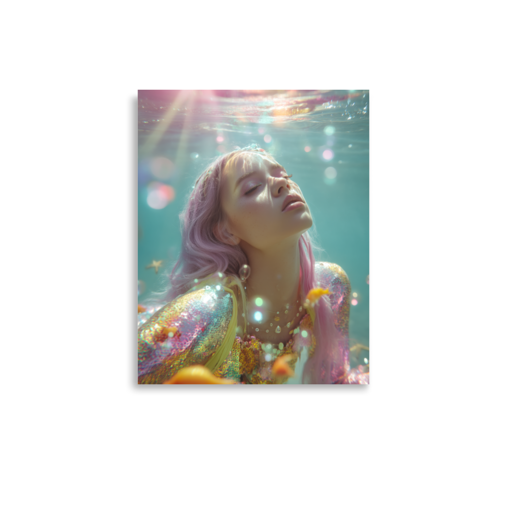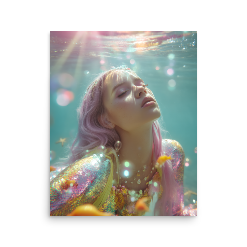 Each print is a surreal underwater fever dream where heartbreak sparkles, sirens shimmer, and disco lights ripple across sequined scales.