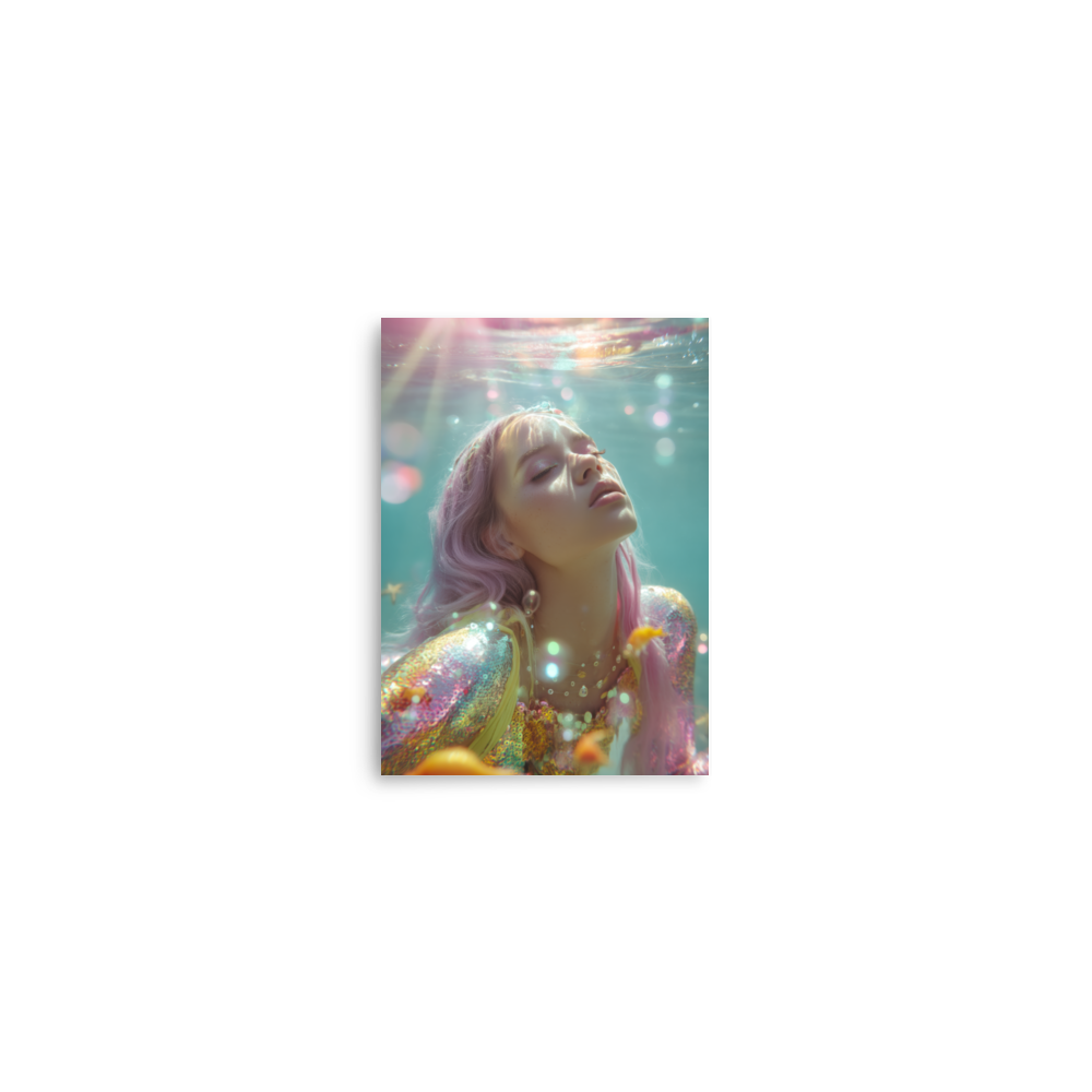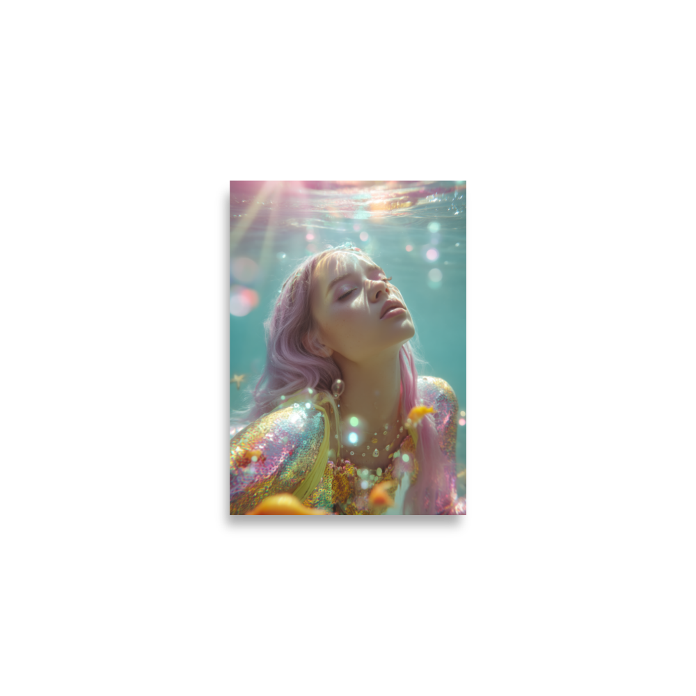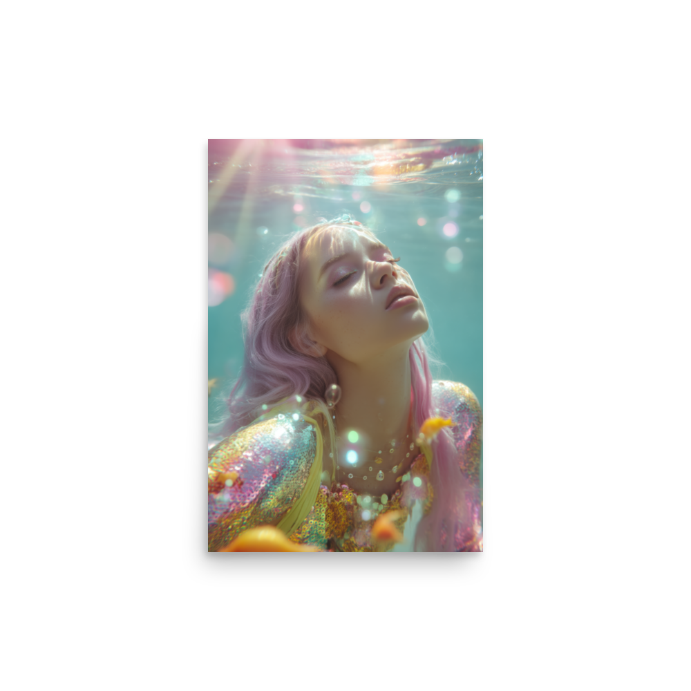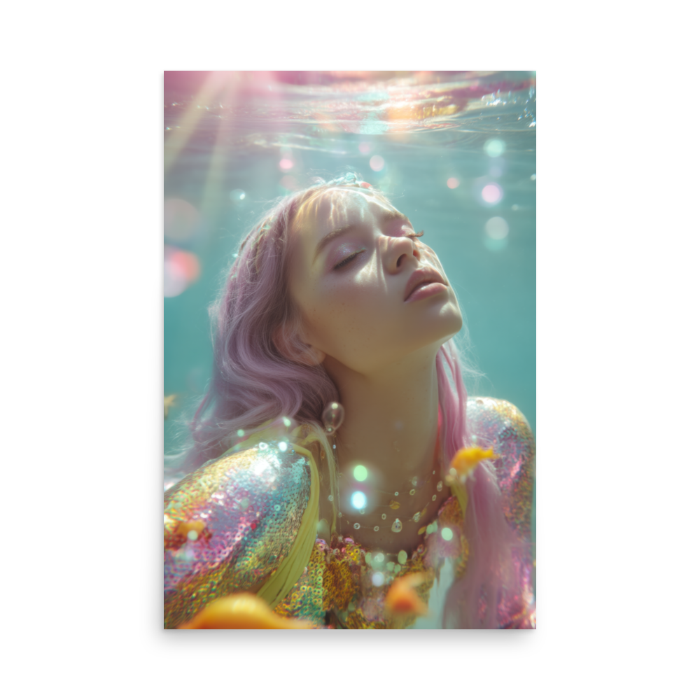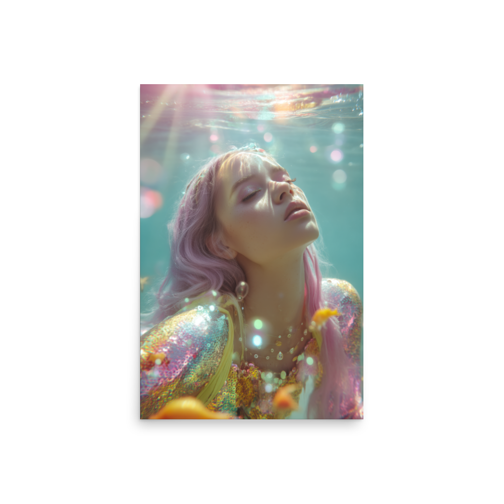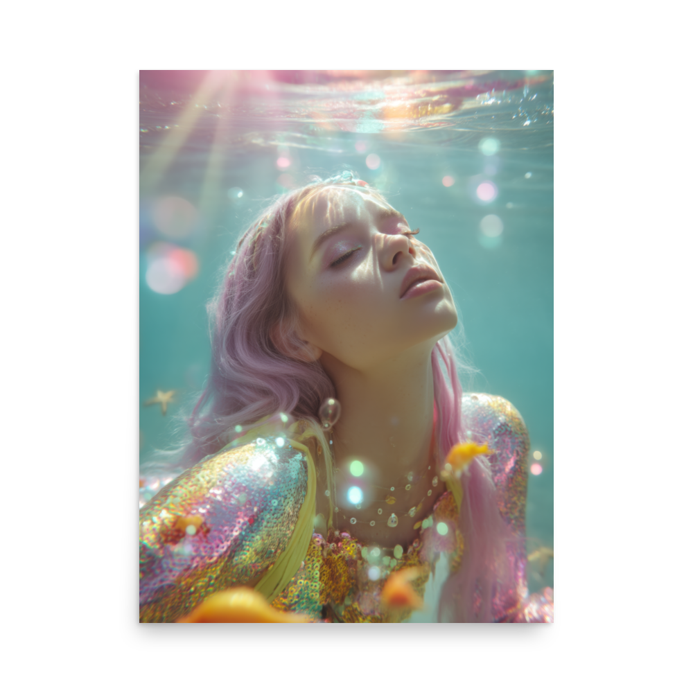 Each print is a surreal underwater fever dream where heartbreak sparkles, sirens shimmer, and disco lights ripple across sequined scales.