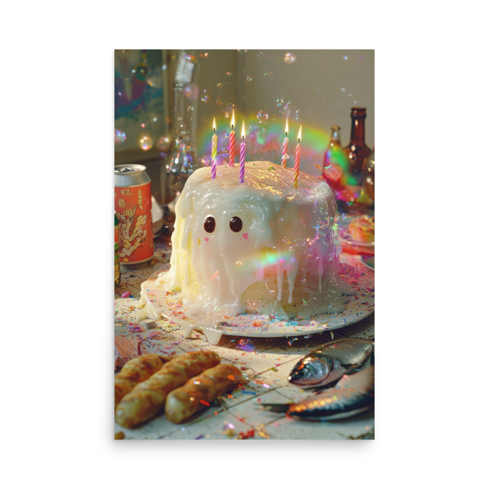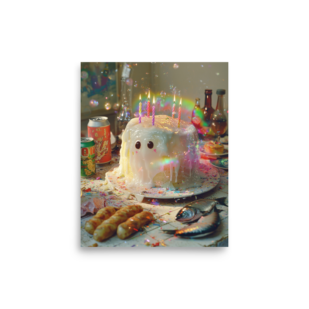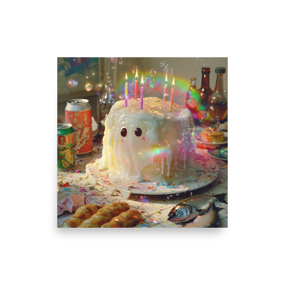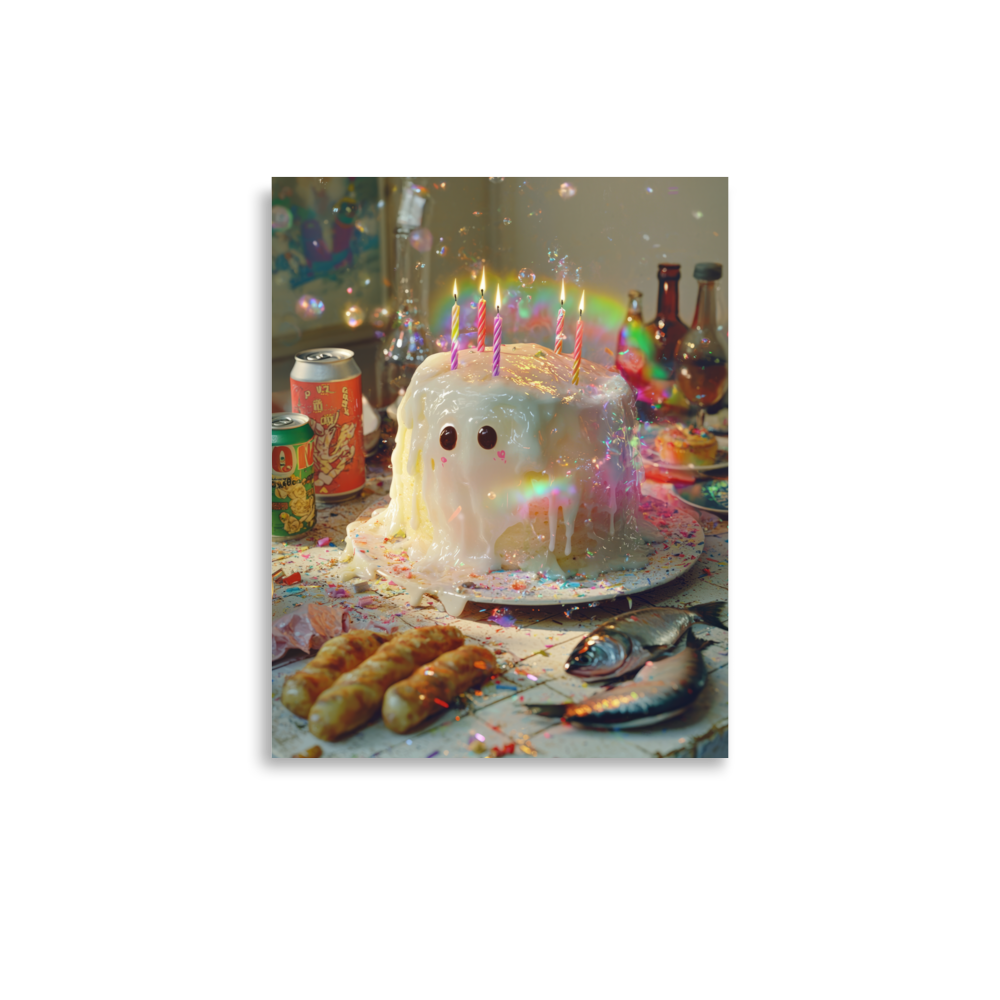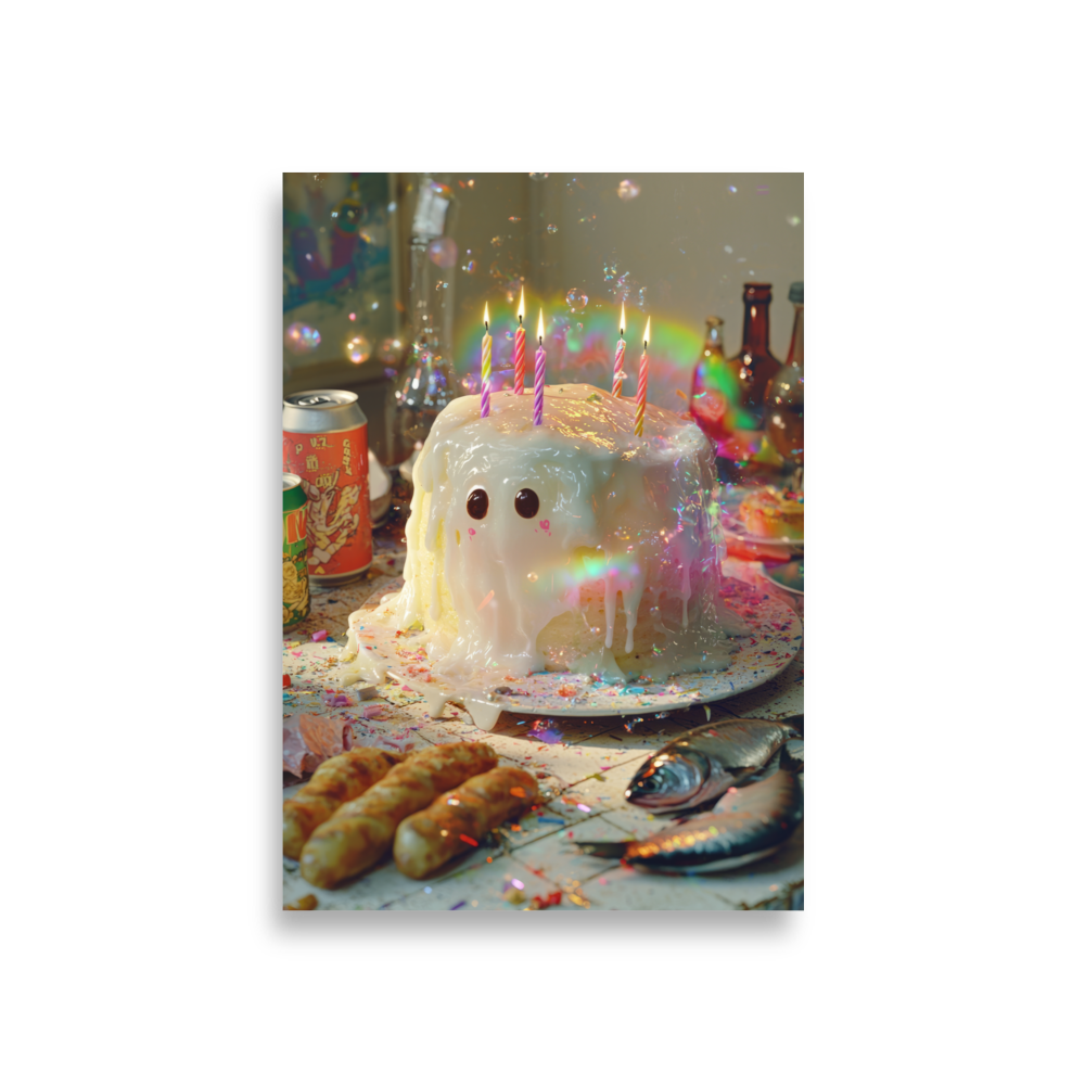 Created by The Creative AI Whisperer, Ai-ngelina Mi Lajki, this glossy pop-art print is both eerie and enchanting — soft, spectral, and sprinkled with nostalgia. A playful wink to the afterlife of indulgence and the beauty of things that linger.