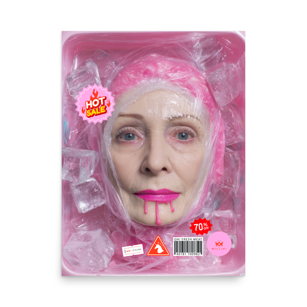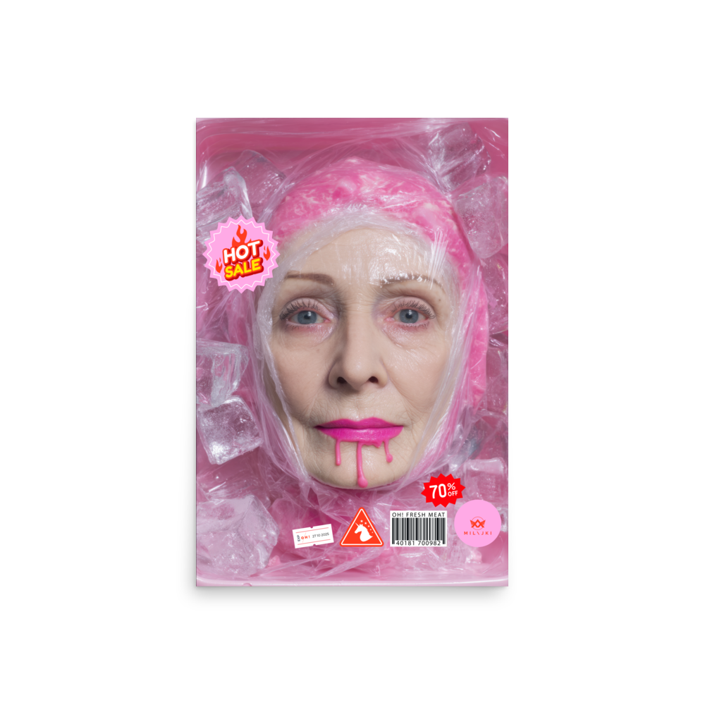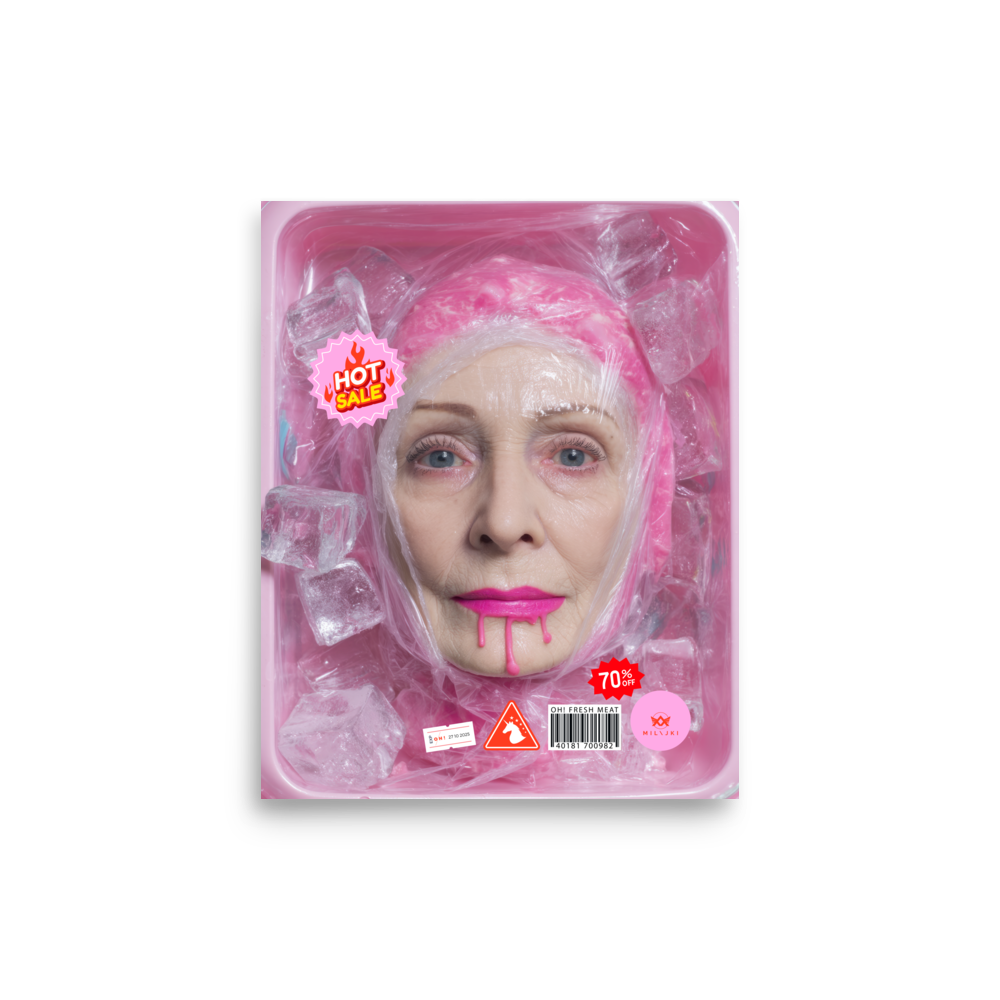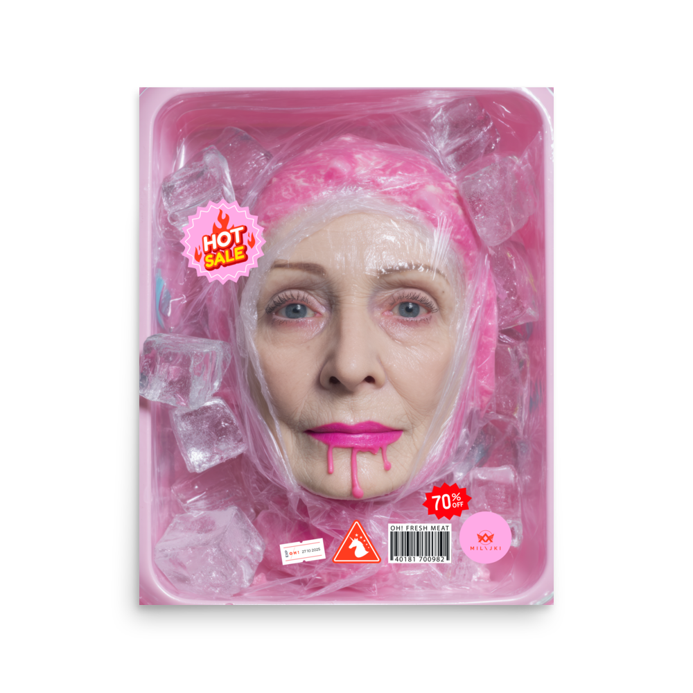 RainbOH!w Nursing Home: Vol. 2 – Fresh Meat – Vanity Insanity is a limited-edition AI art print by The Creative AI Whisperer, Ai-ngelina Mi Lajki — a surreal love letter (and middle finger) to the cult of eternal youth.