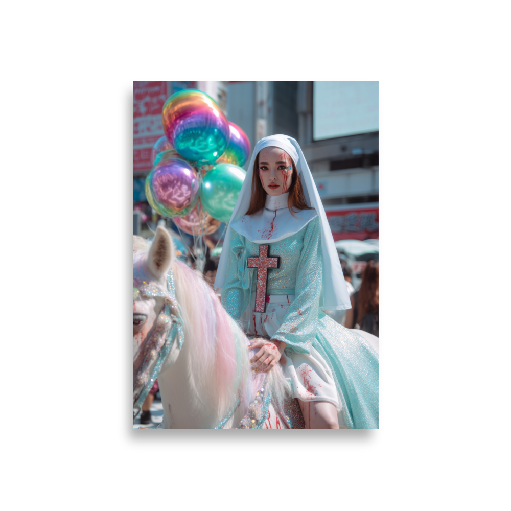 Each poster captures a surreal fragment of the HallOH!ween Glitter Parade in TokyOH! — where faith meets fashion and chaos shimmers in technicolor.