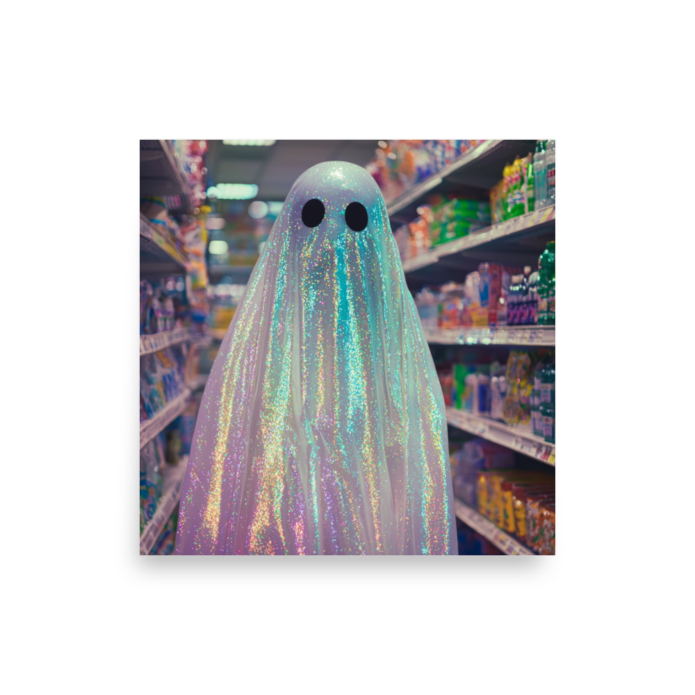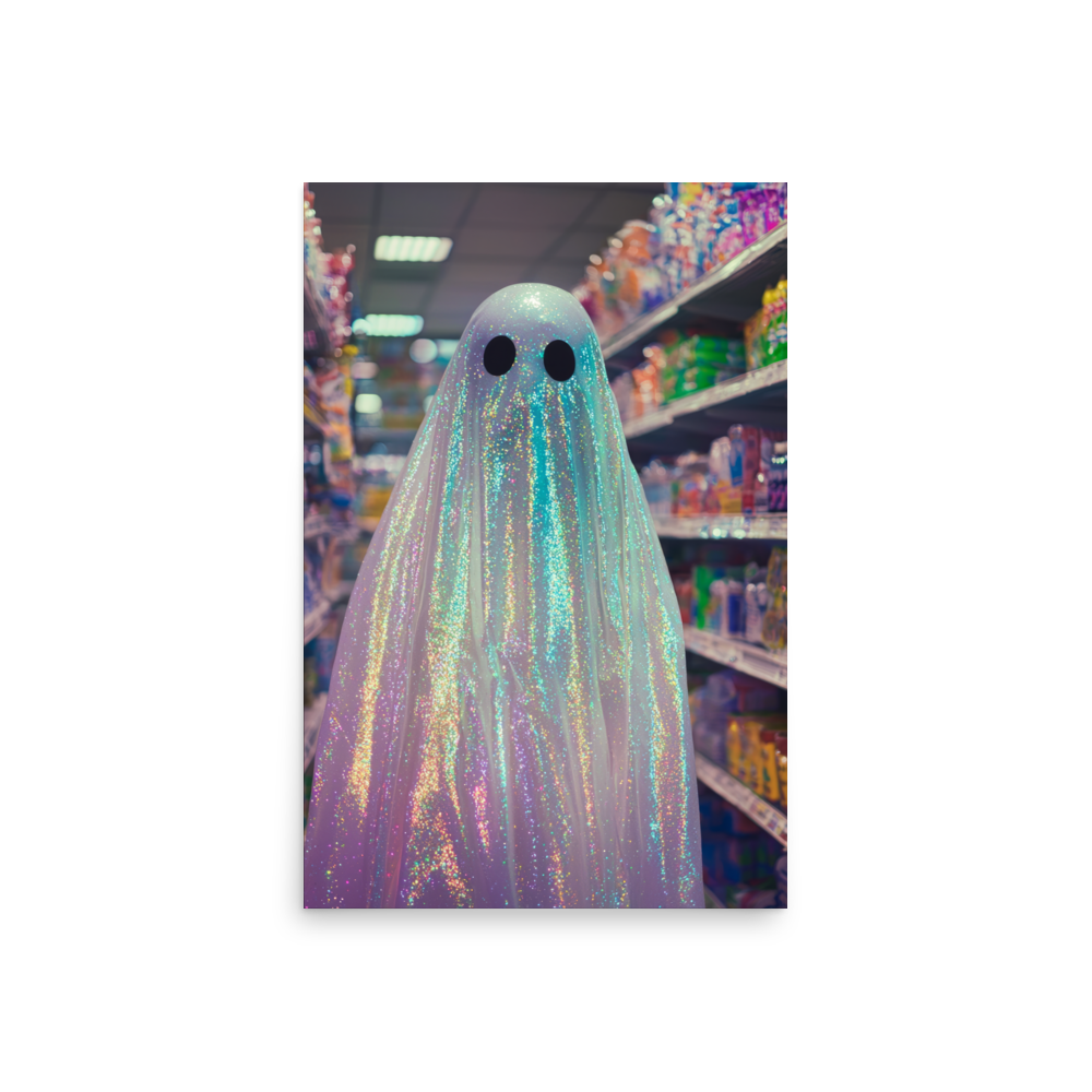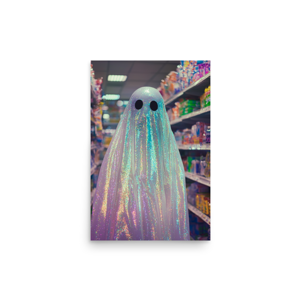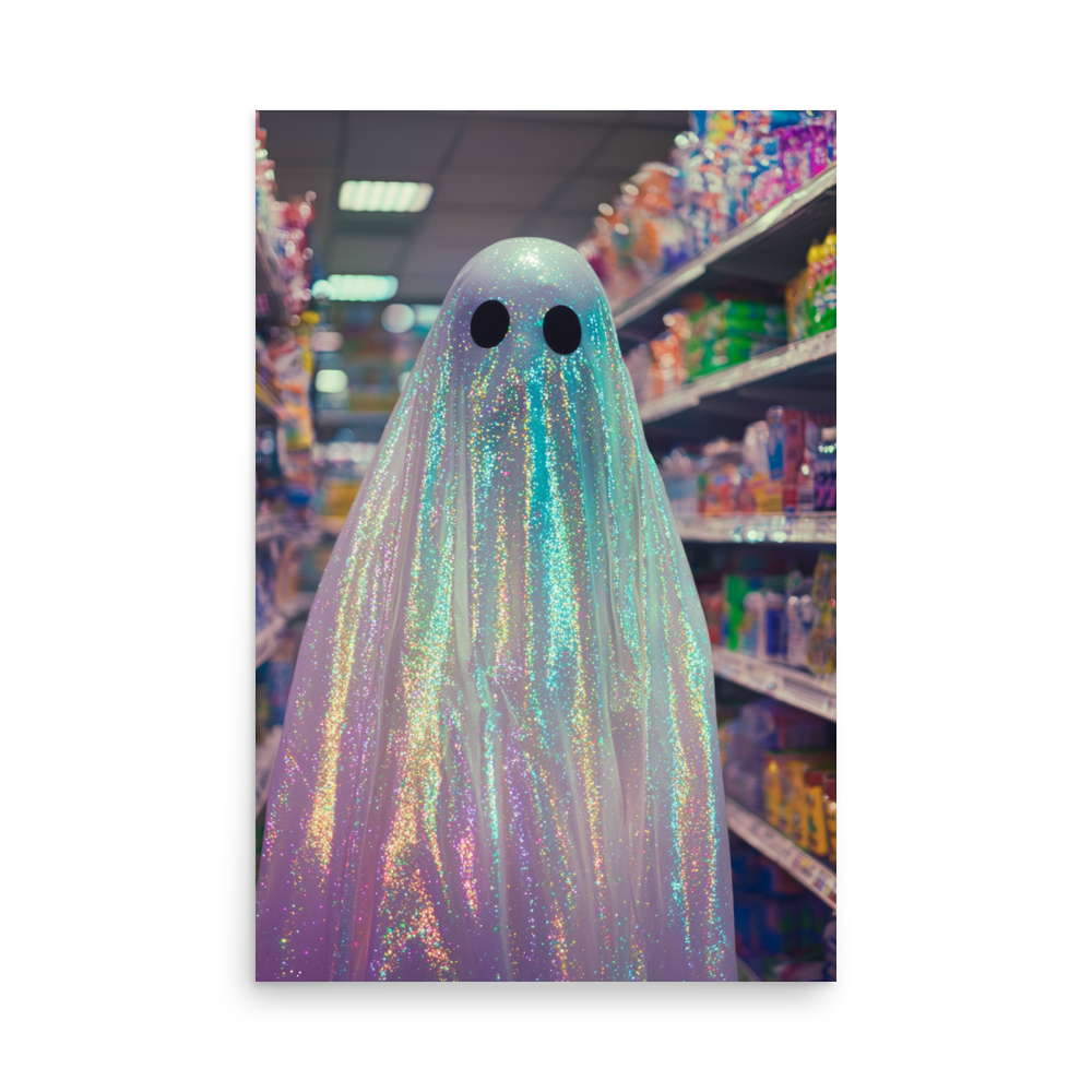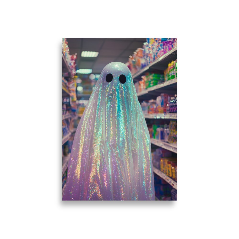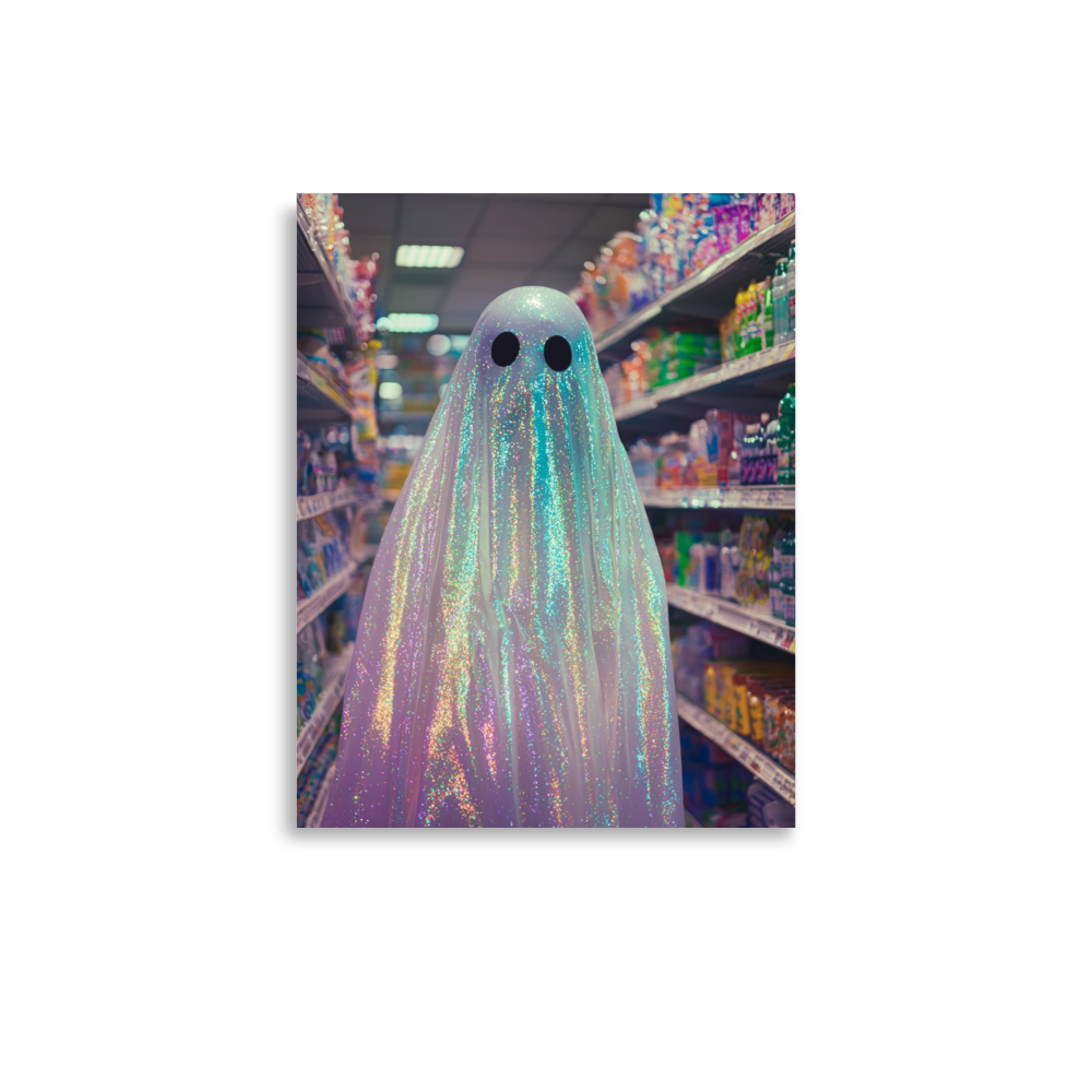 This glitter-dusted ghost is browsing the shelves with a side-eye so sharp it could slice through your weak excuses.