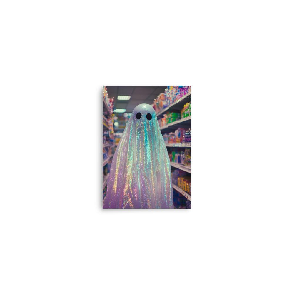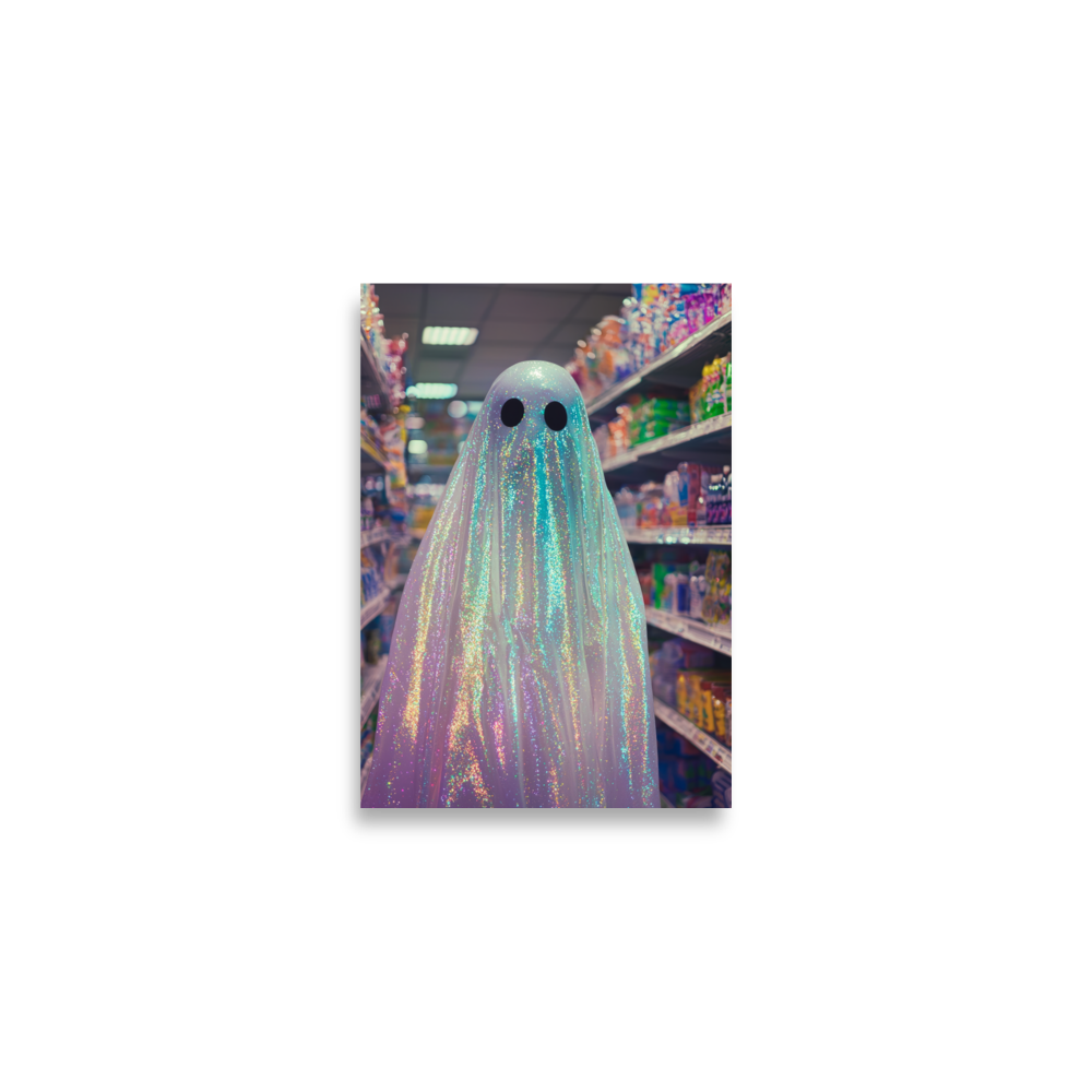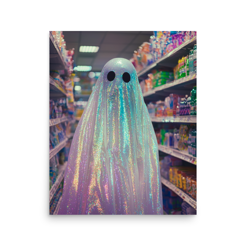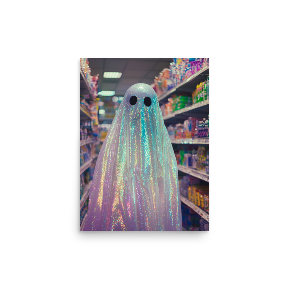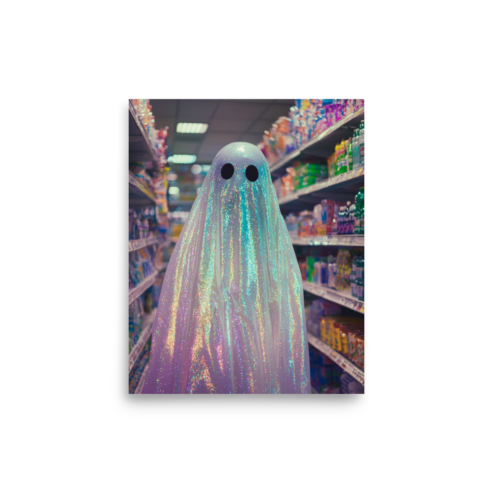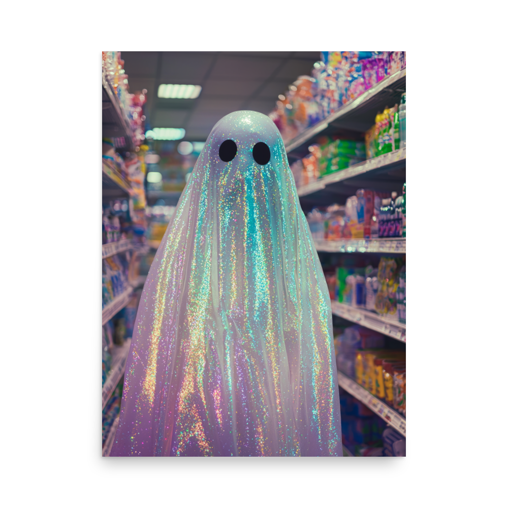 This glitter-dusted ghost is browsing the shelves with a side-eye so sharp it could slice through your weak excuses.