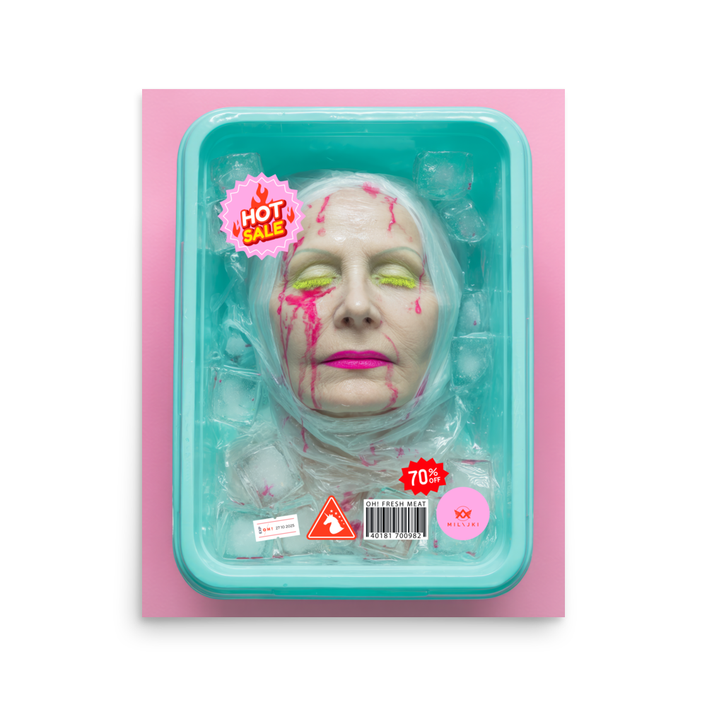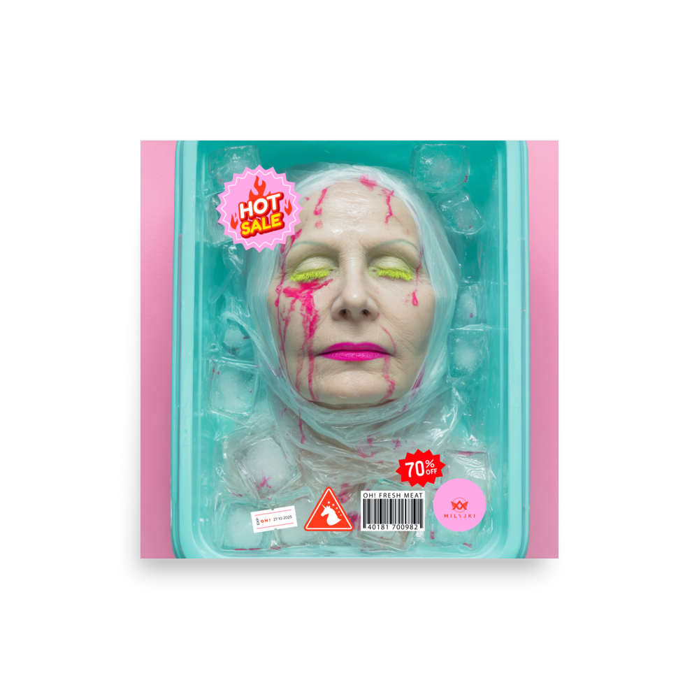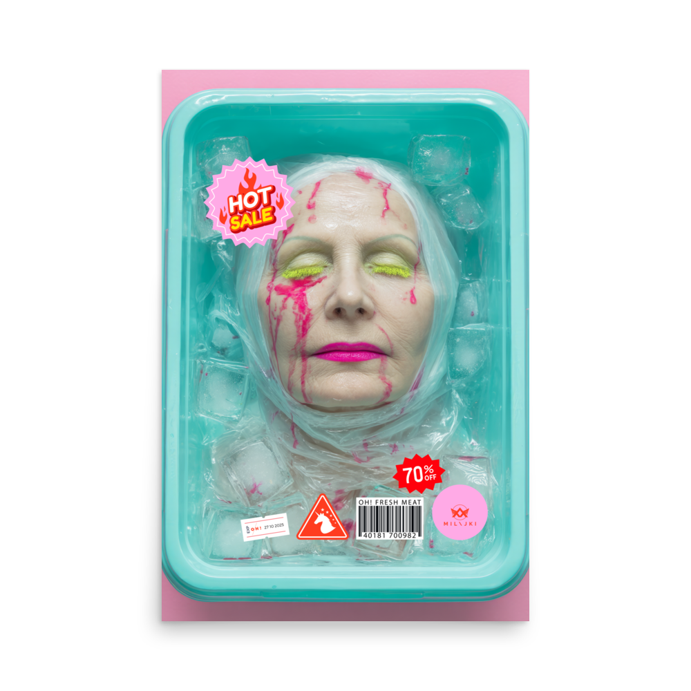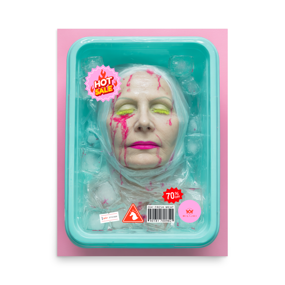 RainbOH!w Nursing Home: Vol. 2 – Fresh Meat – Vanity Insanity is a limited-edition AI art print by The Creative AI Whisperer, Ai-ngelina Mi Lajki — a surreal love letter (and middle finger) to the cult of eternal youth.