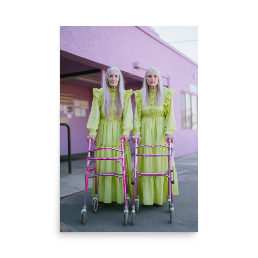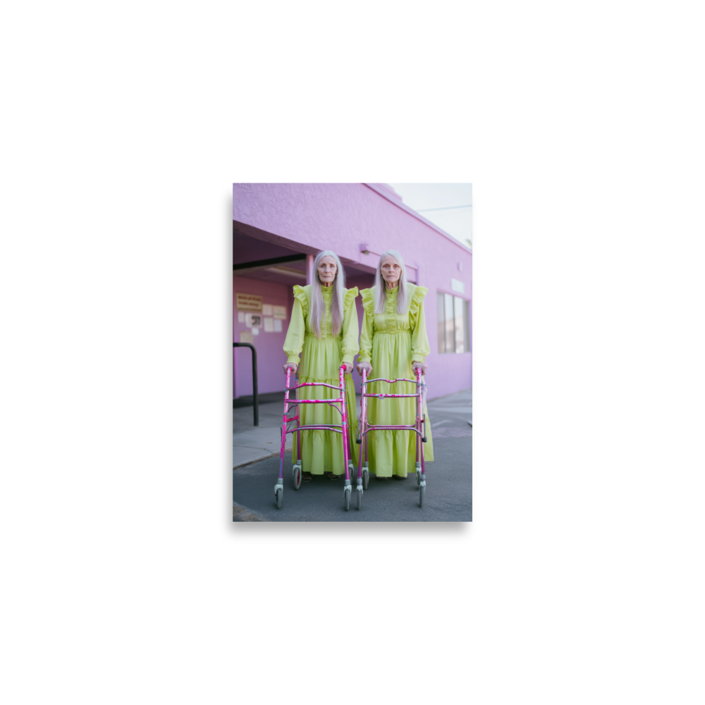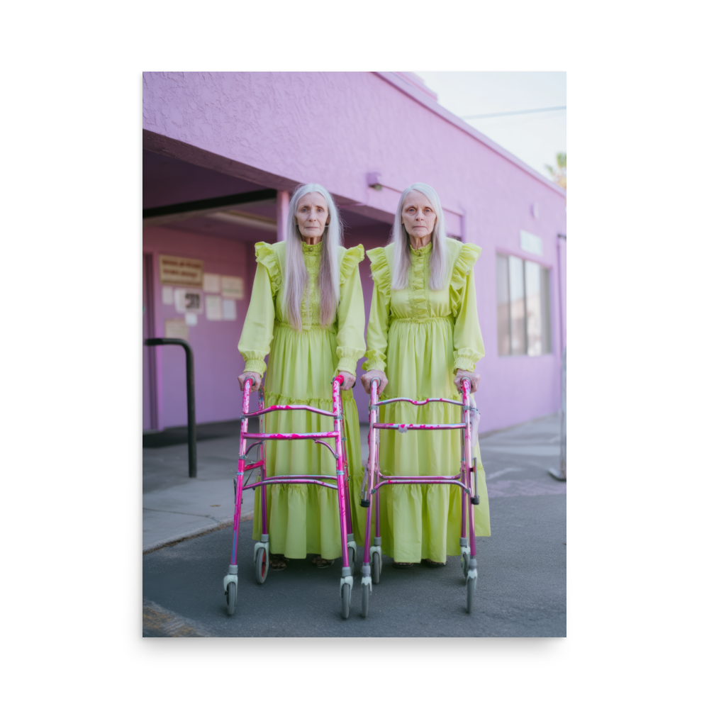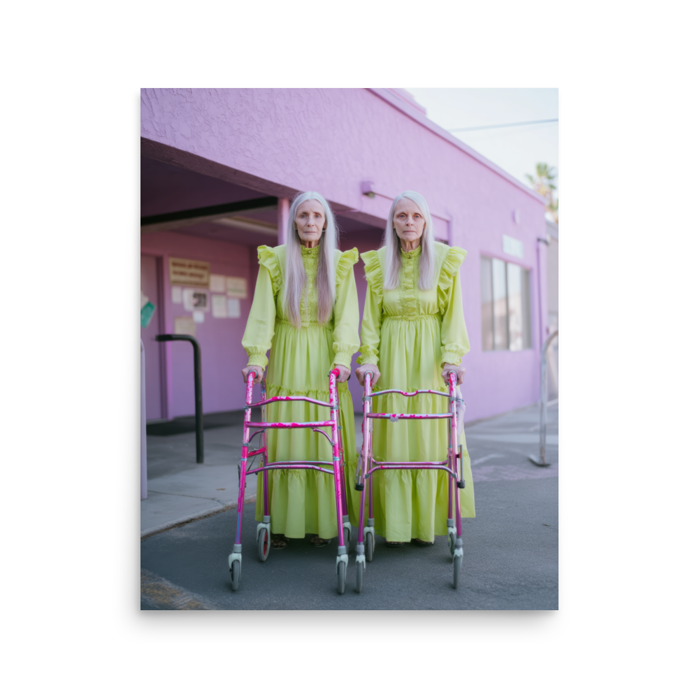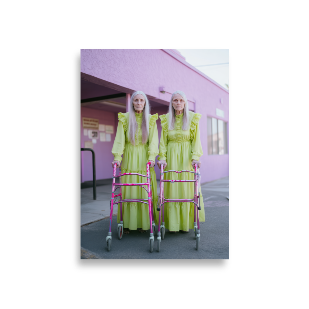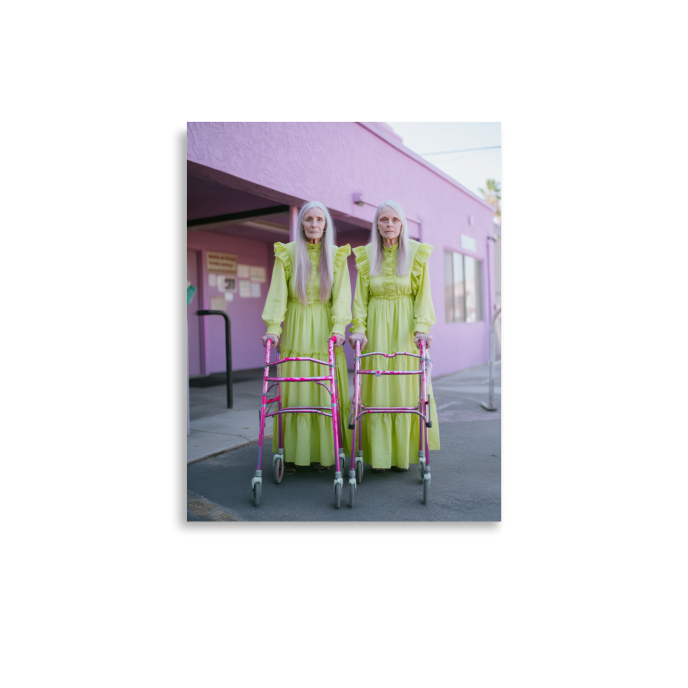 Each artwork captures two twinning icons drenched in dreamy nostalgia and pastel ruffles — glowing proof that sparkle doesn’t expire. Neon lights, disco balls, and rainbow aura swirl together in a surreal world where wrinkles shimmer like sequins and aging becomes the ultimate art form.