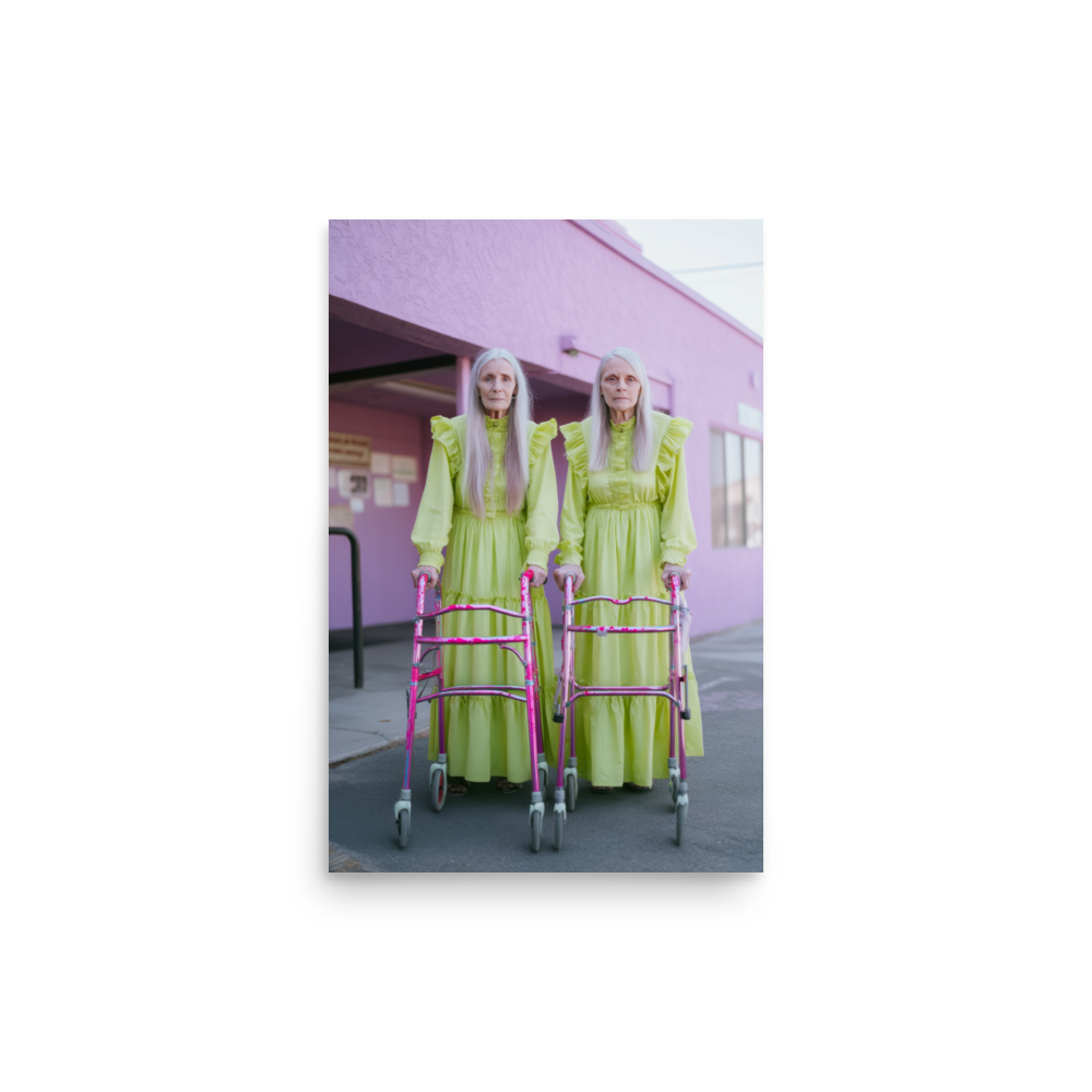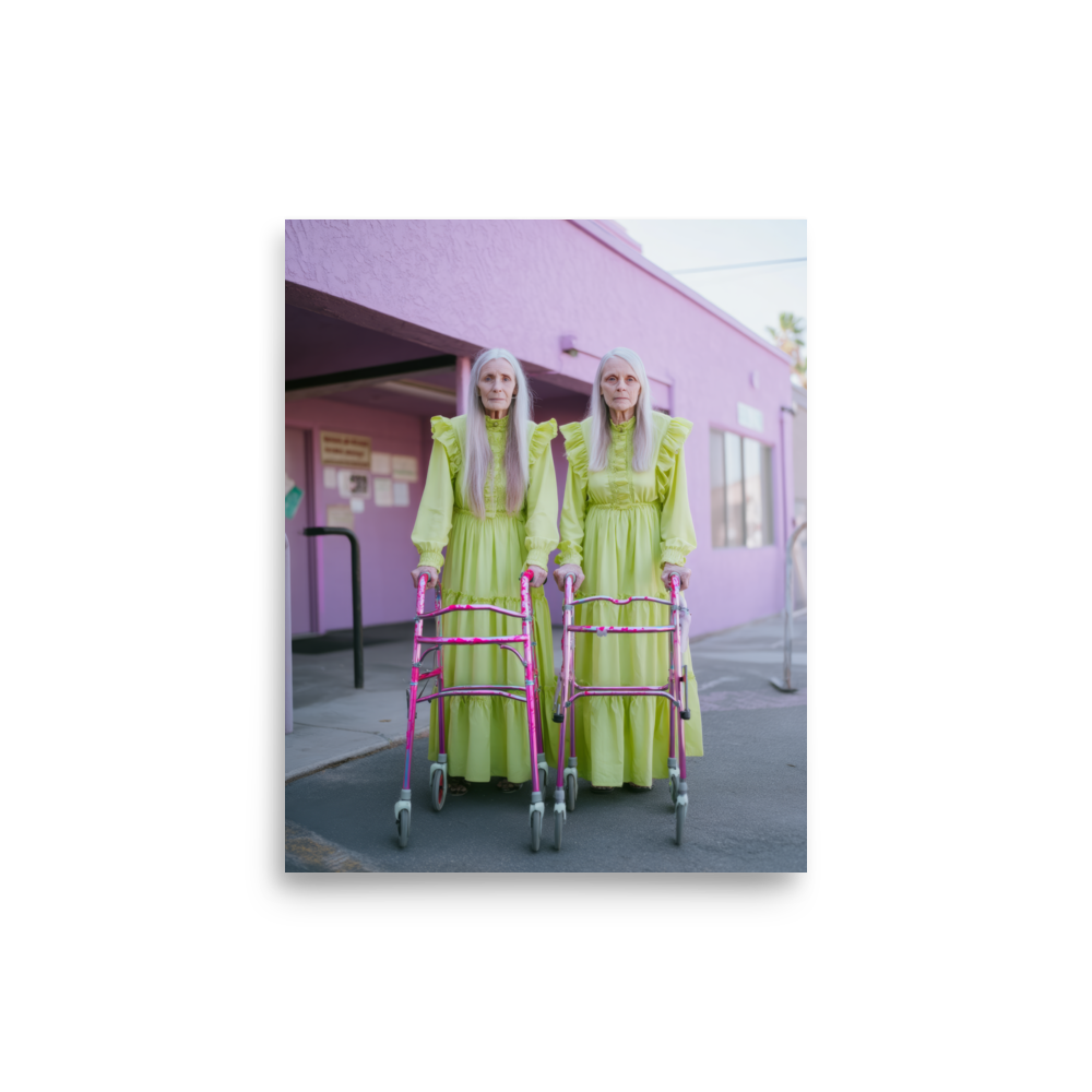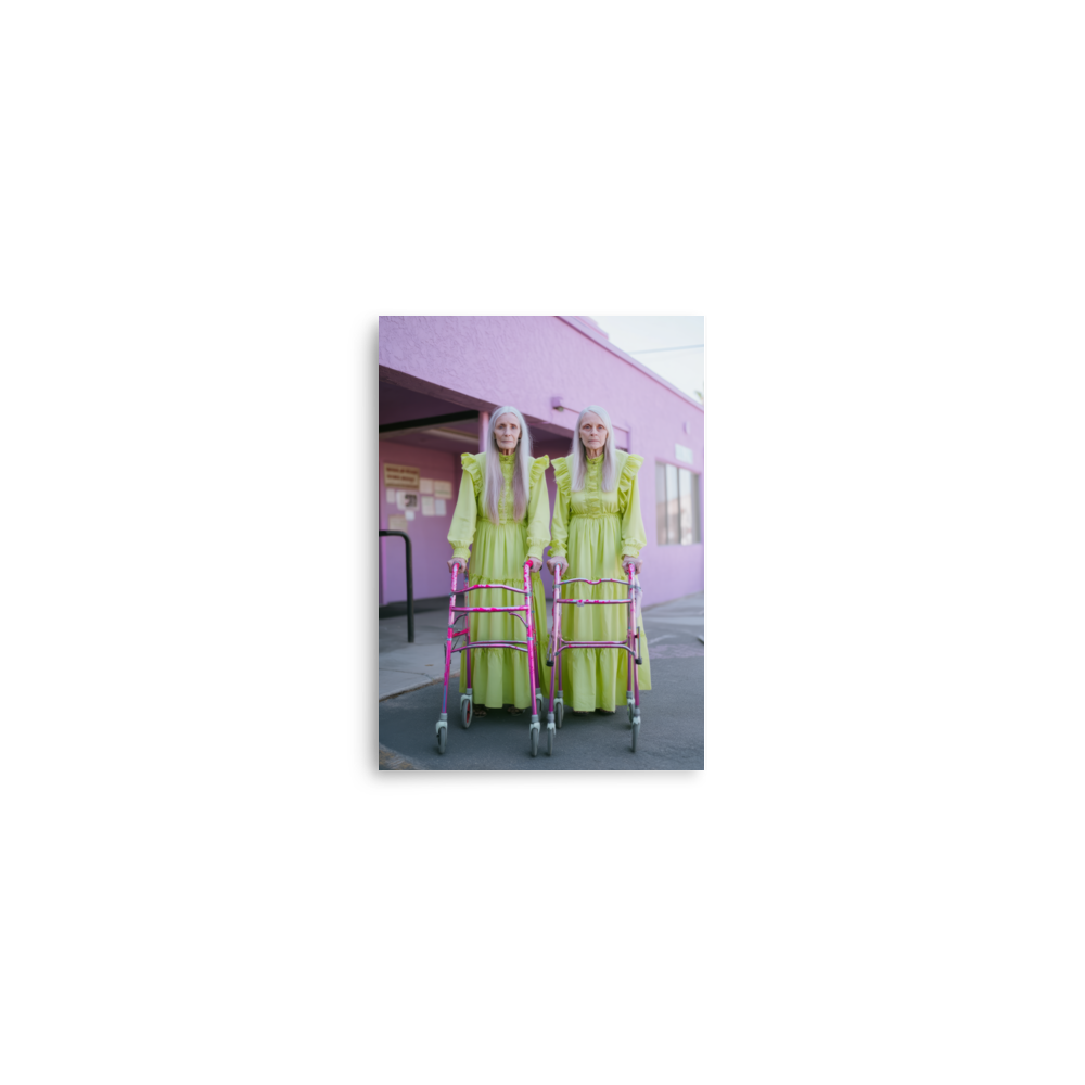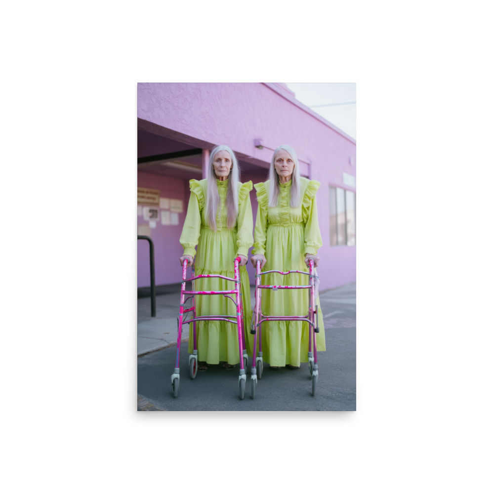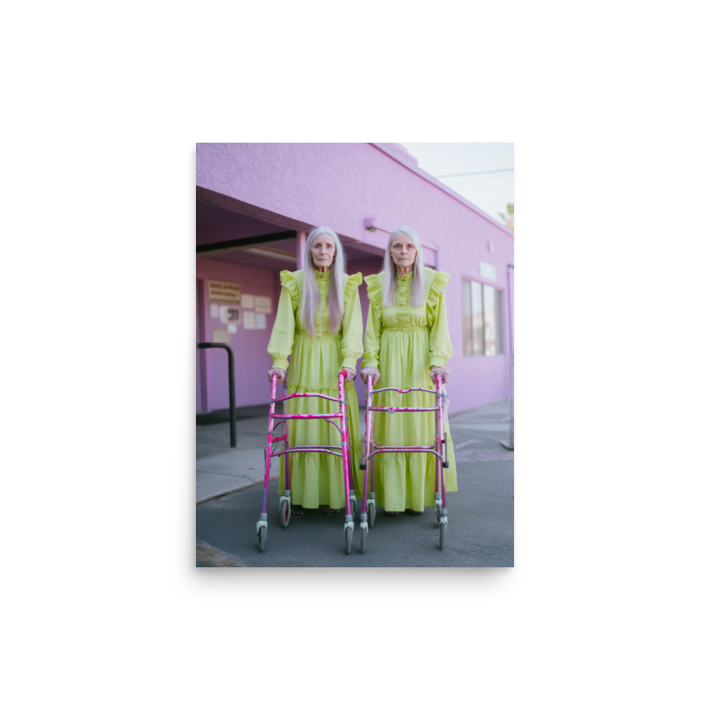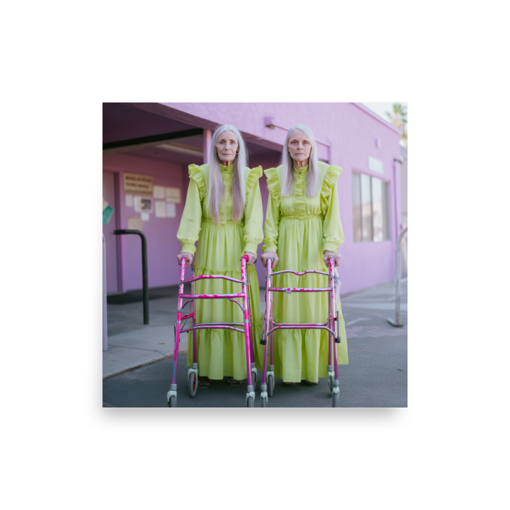 Each artwork captures two twinning icons drenched in dreamy nostalgia and pastel ruffles — glowing proof that sparkle doesn’t expire. Neon lights, disco balls, and rainbow aura swirl together in a surreal world where wrinkles shimmer like sequins and aging becomes the ultimate art form.